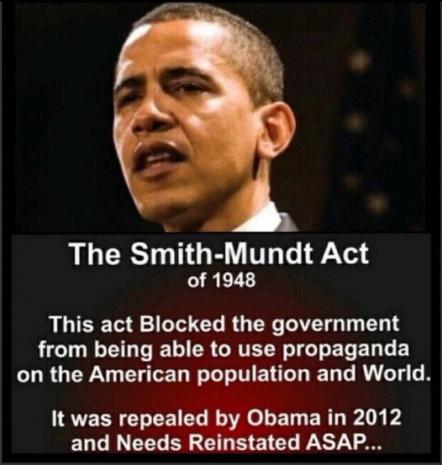 Obama repealed the 'Smith-Mundt Act of 1948' making Government Propaganda Legal against its