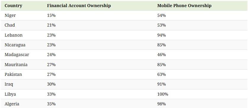 For the most unbanked countries worldwide, here are the percentages of adults who own a financial account and those who own a mobile phone.