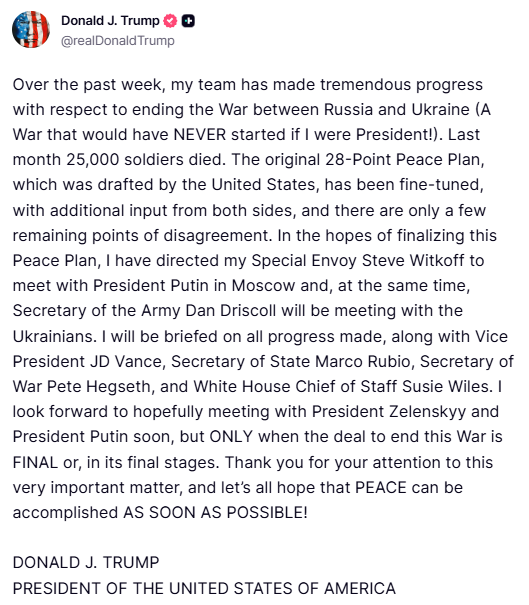 I have directed my Special Envoy Steve Witkoff to meet with President Putin in Moscow and, at the same time, Secretary of the Army Dan Driscoll will be meeting with the Ukrainians.