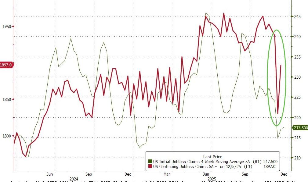 Continuing jobless claims bounced back a little from the big Thanksgiving week plunge but remain well off recent highs...