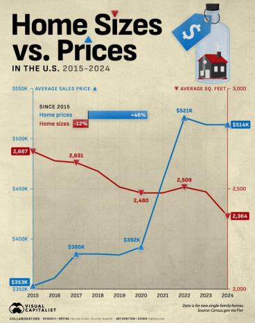 This graphic, via Visual Capitalist's Dorothy Neufeld, shows the typical size versus the average cost of a new home since 2015, based on data from the U.S. Census Bureau via Fixr.