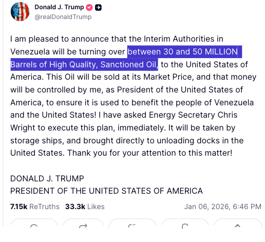 He added, "I have asked Energy Secretary Chris Wright to execute this plan immediately. The oil will be taken by storage ships and brought directly to unloading docks in the United States."