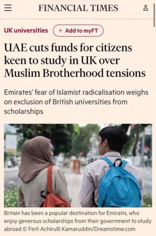 The United Arab Emirates has restricted funding for its citizens who want to study at British universities, the latest sign of tensions over the UK's decision not to proscribe the Islamist Muslim Brotherhood group.