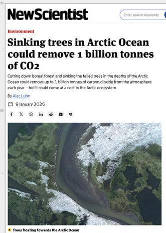 The great northern boreal forest has expanded by 12% since 1984. Which means it has locked up all this extra carbon as it. Instead of waiting for it to catch fire and burn, the thinking is that we could cut it down now, and throw the logs in a river that leads to the Arctic ocean where they will sink and take carbon to the sea floor.