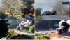 A bus seem engulfed in flames on one of the main avenues in Zapopan, Jalisco, Mexico, on February 22, 2026.