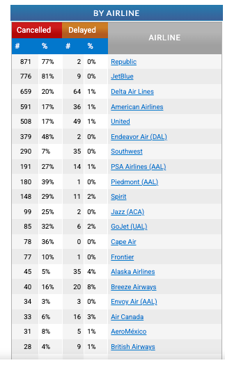 Travel nightmare for Republic Airways, JetBlue, Delta Air Lines, American Airlines, and United early Monday morning, with the bulk of the cancellations affecting these airlines.