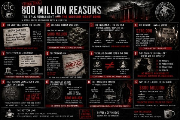 Good morning, C&C family, it's Wednesday! Your special edition roundup breaks down yesterday's most explosive story— the criminal indictment of the so-called Southern Poverty Law Center, which has been a key Democrat institution since the 1970s. Your feeds are packed with hot takes and disinformation, so let's figure out how big this story actually is. Spoiler: it's bigger than the hottest hot takes can imagine.