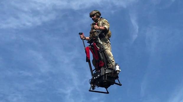 It builds on the platform of Franky Zapata's Flyboard Air, a green goblin-style flying platform with no Segway-style handgrips. The Flyboard Air, like the water-propelled Flyboard that started this whole venture for Zapata, straps you in at the boots, and requires an extraordinary amount of core strength and balance to operate – which its inventor most certainly has.