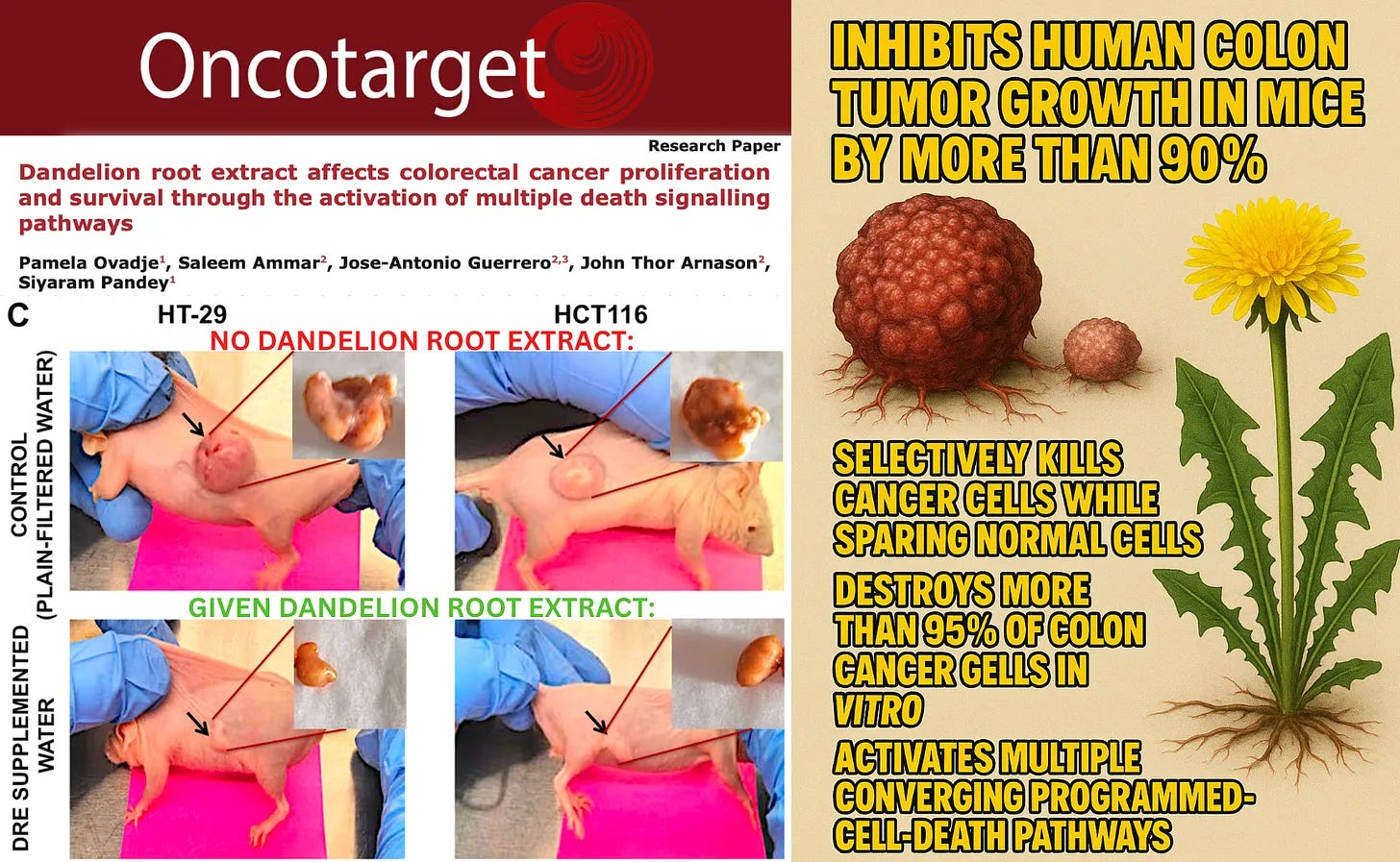A remarkable peer-reviewed study found that aqueous dandelion root extract kills 95% of cancer cells in vitro and reduces human colon tumor growth by over 90% in mice — with zero toxicity.