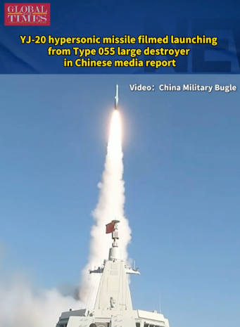 "An official Chinese media account, China Military Bugle, on Sunday unveiled the moment when a YJ-20 hypersonic anti-ship missile was launched from a Type 055 large destroyer of the Chinese People's Liberation Army (PLA) Navy," Global Times said.