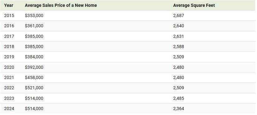 With the exception of 2022 and 2023, the average square footage of new homes has declined since 2015. In contrast, home prices have jumped 46% over the decade, averaging $514,000 in 2024 due to strong housing demand.