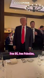 During Trump's 'surprise' appearance to Joe's Seafood, Prime Steak & Stone Crab, a group of Code Pink protesters were able to get unusually close to the president. The noisy activists stood feet from the President across a table and chanted: 'Free DC! Free Palestine! Trump is the Hitler of our time!'
